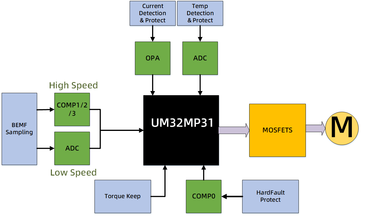 ADC反电势获取(低速)+内置3路比较器(高速)切换控制
