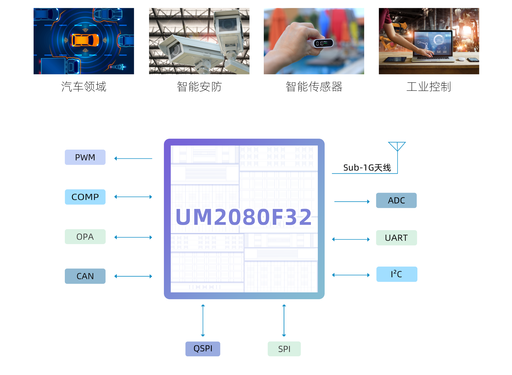 UM2080F32外部搭配通用标准振荡器晶体,外围零件少,整体成本颇具竞争力,适用于智能协议控制的节点,或者小网关等多种智能化应用场景;可应用在汽车,工业控制、智能安防、仓储物流、传感与表计、智能家居、智能照明等低功耗广域网应用场景。