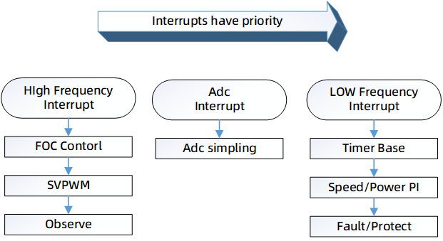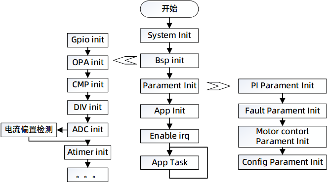 控制器上电后进入系统配置,依次进行IO端口配置,AD转换模块配置,定时器的配置,中断初始化,定时器初始化,保护参数初始化,交互参数初始化,初始化状态检测,使能中断,最后进入主循环(App-Task)执行相应app层事件。电机控制部分主要在高频中断中执行运算,主要处理FOC运算部分,及位置速度观测器。ADC中断主要处理采样数据,低频中断主要处理速度/功率外环控制部分及故障检测部分。