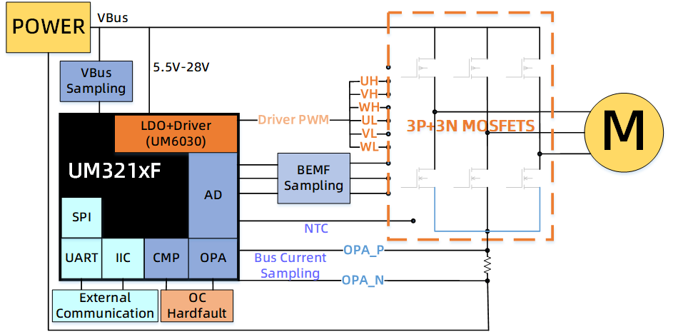 1.内置5V LDO Power电源直接输出至MCU(支持5.5-24V宽电压输入);3.内置3路比较器快速直接获取反电势信号或硬件过流保护 ;4.PWM支持与比较器的联动,异常情况紧急停机保护机制,有效防止功率元器件损坏;6.丰富的外设接口(SPI/UART/IIC/CAN),支持多传感器扩展功能;7.板极ESD设计可靠度可达8KV以上,得益于太阳成集团tyc122ccUM321xF芯片优异的ESD性能;8.高集成度、高可靠性、低功耗MCU,电机控制相关外围器件只有40个左右,大大降低设计及生产成本,降低器件失效不良率。