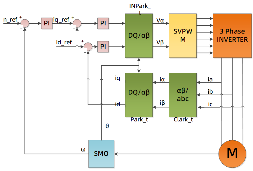 电机控制算法采用单电阻无感FOC的电流转速双闭环控制系统: