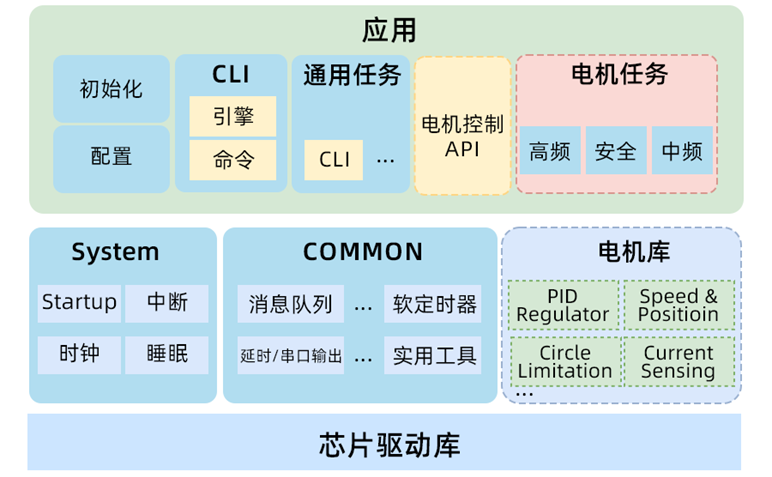 此方案整个软件工程分为应用层、System、Common及电机库。应用层包含系统初始、系统配置、CLI引擎、通用任务、电机控制API、电机任务等。System层包含Startup启动、中断服务、时钟、睡眠与低功耗等。Common层包含消息队列、软定时器、延时/串口输出、实用工具等。电机库包含PID 环路、换相函数处理、芯片驱动库等。